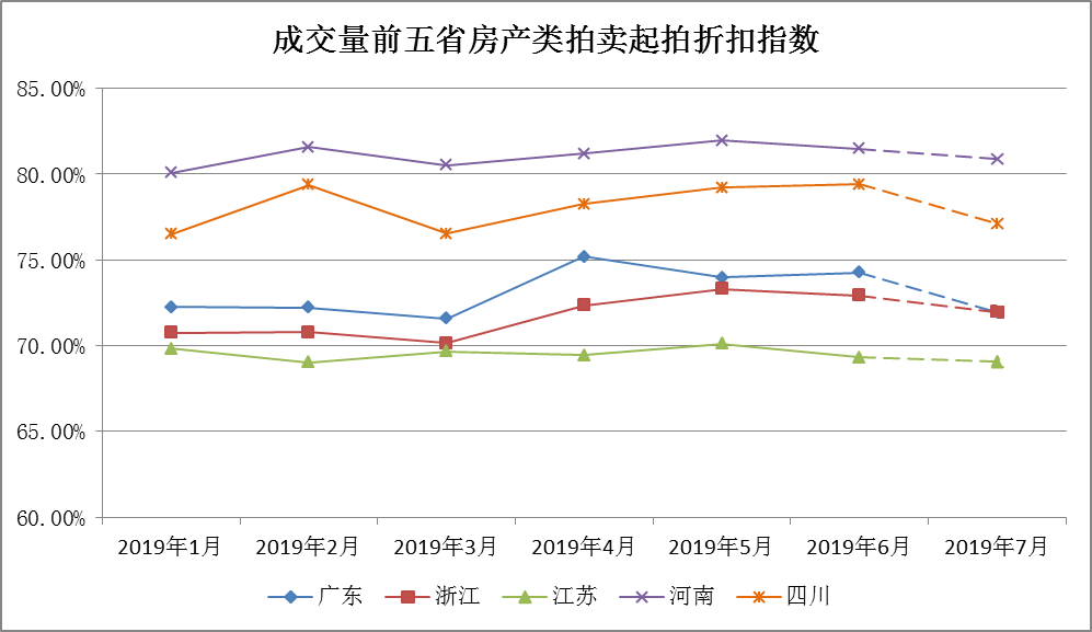 2019年各省房產拍賣起拍折扣指數的變化趨勢基本趨同,總體而言起拍折扣指數范圍在70%~80%左右;河南、四川省的起拍折扣指數較高,廣東省的起拍折扣指數波動較大,未來五省的起拍折扣指數均有下降趨勢。