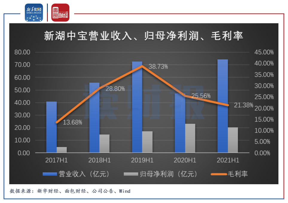 近期,新湖中寶披露2021年半年報,公司實現營業收入74.42億元,同比上升57.19%;歸母凈利潤20.26億元,同比減少12.91%。