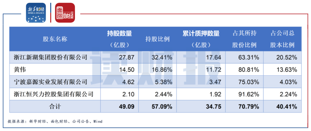 截至2021年9月4日,公司大股東新湖集團、黃偉、寧波嘉源、恒興力控股累計未解押股權質押數量為34.75億股,合計占其所持股份的70.79%、占公司總股本的40.41%。