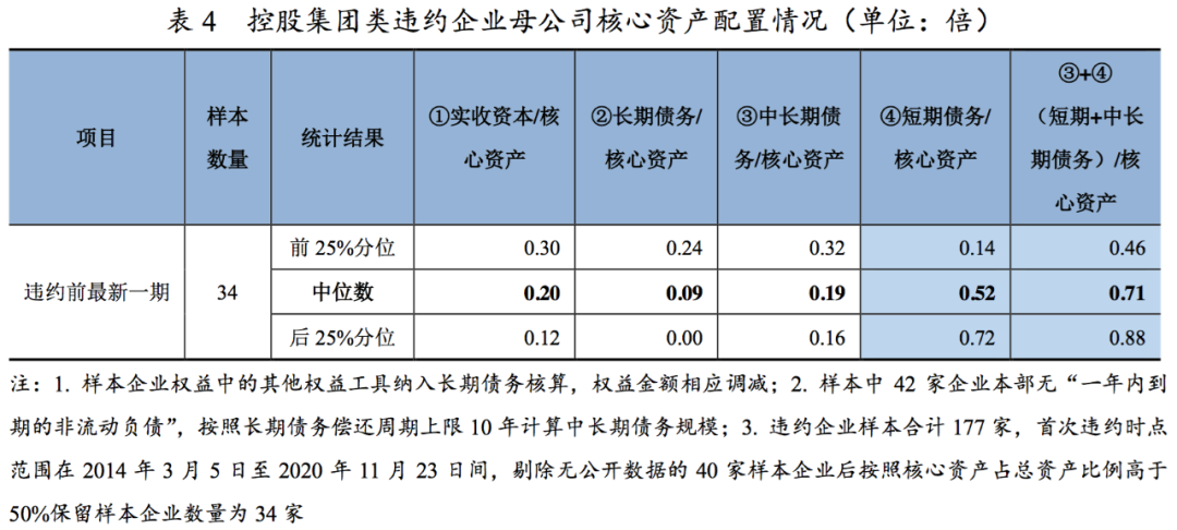 整體看,違約企業在長期核心資本配置方面使用了很高比例的短期債務和中長期債務滾動續期,在外部融資環境收縮的背景下加速導致最終的信用風險暴露。