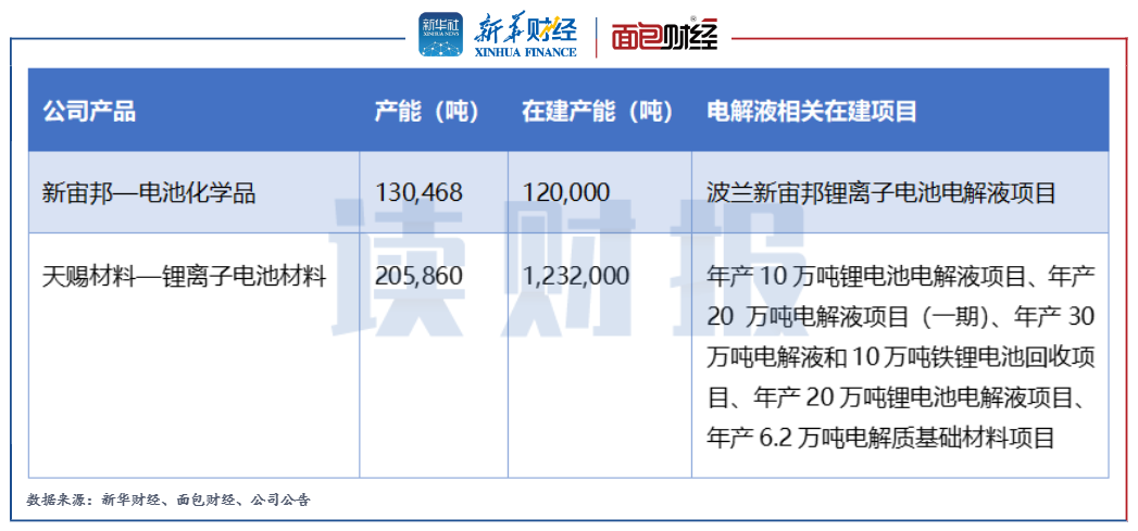 除此之外,2021年12月,天際股份提出定增預案,擬投資建設江蘇泰瑞聯騰材料科技有限公司3萬噸六氟磷酸鋰(主要電解質材料)、6,000噸高純氟化鋰等新型電解質鋰鹽及一體化配套項目。11月,石大勝華公告擬投資建設30萬噸/年電解液項目。
