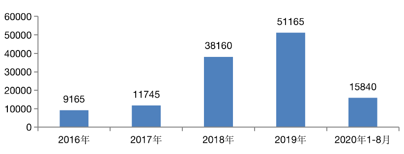 圖:2016-2020年山東省增減掛鉤節余指標流入量(畝)