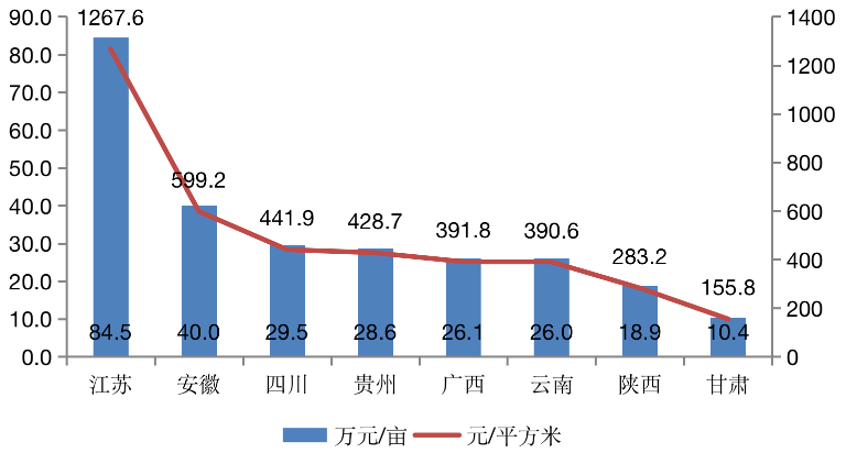 注:為便于對照本章其他章節,上圖同時列出“萬元/畝”和“元/平方米”的單位