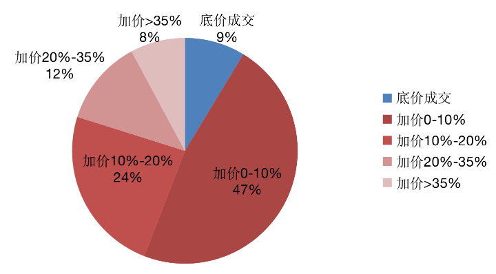 東部區域中,經濟更為發達的東南沿海省份用地指標爭奪更為激烈。以江蘇省為例,截止2020年6月,江蘇各城市競得的增減掛鉤節余指標高達44471畝,僅3857畝是底價成交,占比僅有8.7%,其余指標均是加價成交,近半數用地指標加價幅度小于10%,另有36%的指標加價幅度在10%-35%之間,加價幅度在35%以上的指標占比也占到8%,這一系列數據顯示出江蘇省內各城市用地指標的激烈程度。