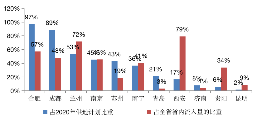 圖:典型城市省內土地流入量省內集中度和其占建設用地計劃供應量比重