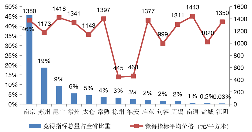 從各城市報價來看,徐州、淮安等蘇北城市比較青睞底價在30萬元/畝(折合450元/平方米)左右、價格比較低的指標,并且加價幅度多不超過3000元/畝,比較謹慎;反之,蘇州、南京等中心城市在競價中出價比較高,多在90萬元/畝以上,并且加價幅度也較大,多在5萬元/畝以上。值得注意的是,加價幅度最高的這8%用地指標均是江蘇省會南京競得的。就各市獲得流轉土地的平均價格來看,南京高達92萬元/畝,即1380元/平方米,明顯高于1268元/平方米全省平均水平。