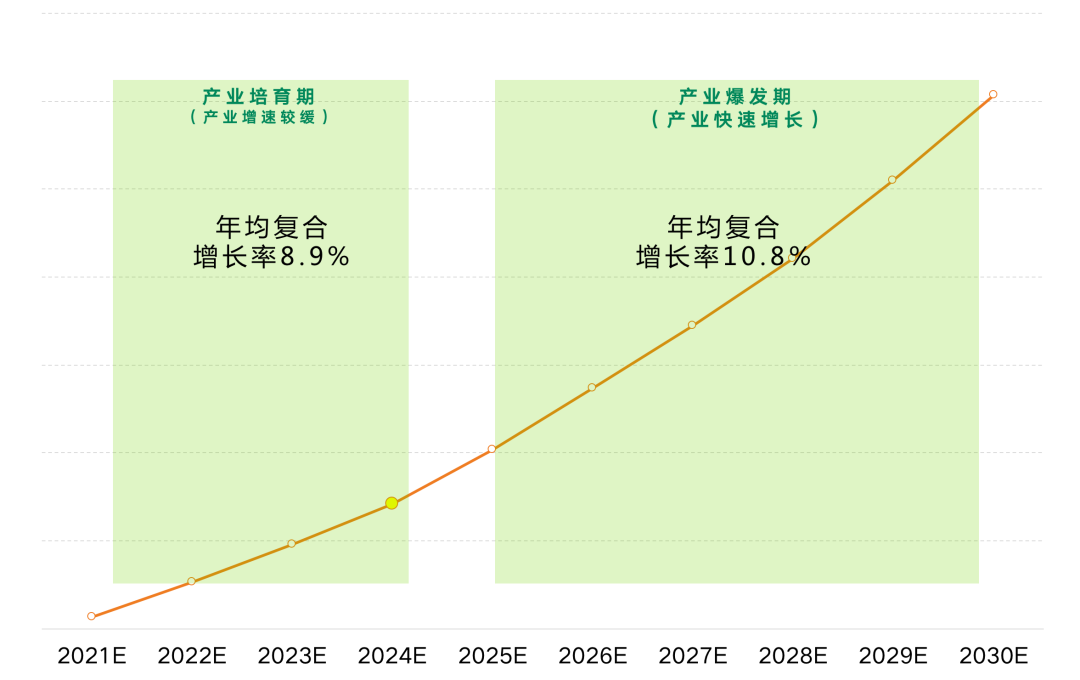 根據(jù)2020-2030年養(yǎng)老產(chǎn)業(yè)規(guī)模數(shù)值計(jì)算,2020-2024年養(yǎng)老產(chǎn)業(yè)規(guī)模復(fù)合增長(zhǎng)率為8.9%,而2025-2030年養(yǎng)老產(chǎn)業(yè)復(fù)合增長(zhǎng)率為10.8%,意味著未來五年養(yǎng)老產(chǎn)業(yè)將提前完成產(chǎn)業(yè)孵化,轉(zhuǎn)而邁入產(chǎn)業(yè)爆發(fā)期。