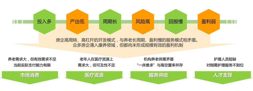 養(yǎng)老具有“投入多、產(chǎn)出低,周期長(zhǎng)、風(fēng)險(xiǎn)高、回報(bào)慢,盈利弱”等特點(diǎn),養(yǎng)老行業(yè)用地難、融資難、盈利難等痛點(diǎn)依然存在,尤其是在“醫(yī)養(yǎng)融合、醫(yī)保異地結(jié)算、長(zhǎng)護(hù)險(xiǎn)互認(rèn)、以及養(yǎng)老結(jié)構(gòu)性方面等”問題尤為突出,養(yǎng)老產(chǎn)業(yè)痛點(diǎn)與矛盾突出,行業(yè)仍需進(jìn)一步變革。