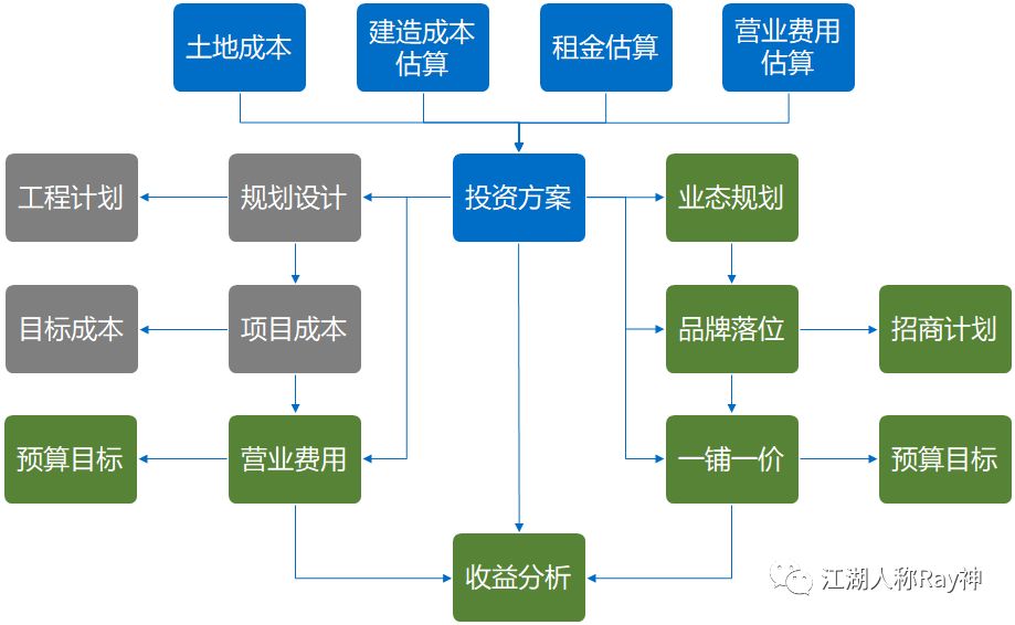 對于這一過程,行業(yè)內(nèi)通常會通過投策定案來進(jìn)行管理,但往往出現(xiàn)的問題就是投策與運營脫節(jié),制定的目標(biāo)無法在運營期落地。因此,問題的關(guān)鍵也就是在解決如何把投資方案與運營方案協(xié)同起來。以購物中心為例,這一協(xié)同就涉及到我們?nèi)绾芜M(jìn)行業(yè)態(tài)規(guī)劃、品牌落位和一鋪一價的制定,進(jìn)而落實到可執(zhí)行的招商計劃和預(yù)算目標(biāo)上。