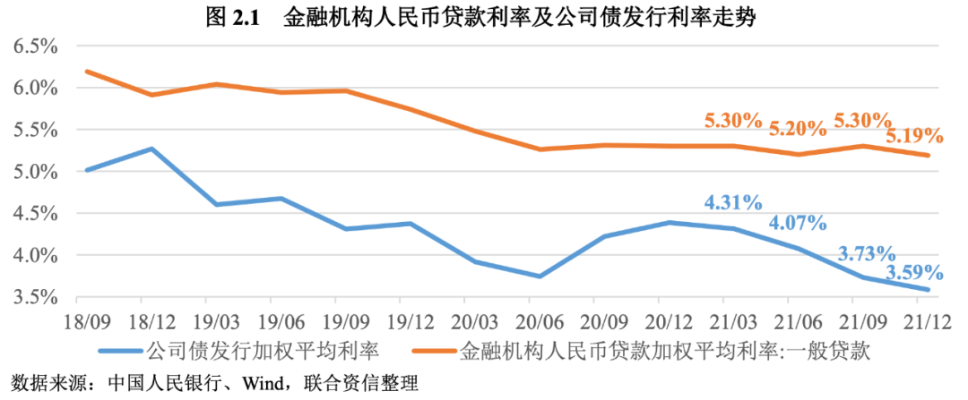 2021年,貨幣供給靈活適度,貸款利率穩中有降,公司債發行利率前高后低,企業綜合融資成本穩中有降。2021年,穩健的貨幣政策靈活精準、合理適度,央行綜合運用降準、公開市場操作、中期借貸便利等工具,保持流動性合理充裕。綜合運用多種貨幣政策工具投放流動性。2021年7月和12月兩次降準各0.5個百分點,共釋放長期資金2.2萬億元,疊加多種結構性貨幣政策,促進銀行資金成本下降。企業綜合融資成本穩中有降。2021年,LPR基本維持穩定,人民幣一般貸款加權平均利率有所波動,12月1年期LPR下行5個基點至3.8%,打破19個月連續持平的局面,引導下一階段實體經濟貸款利率下行。二季度起,流動性寬松預期加強,疊加地方政府債發行滯后、局部信用收縮等原因導致的機構欠配壓力增加,公司債發行加權平均利率持續下降,推動企業部門綜合融資成本穩中有降。