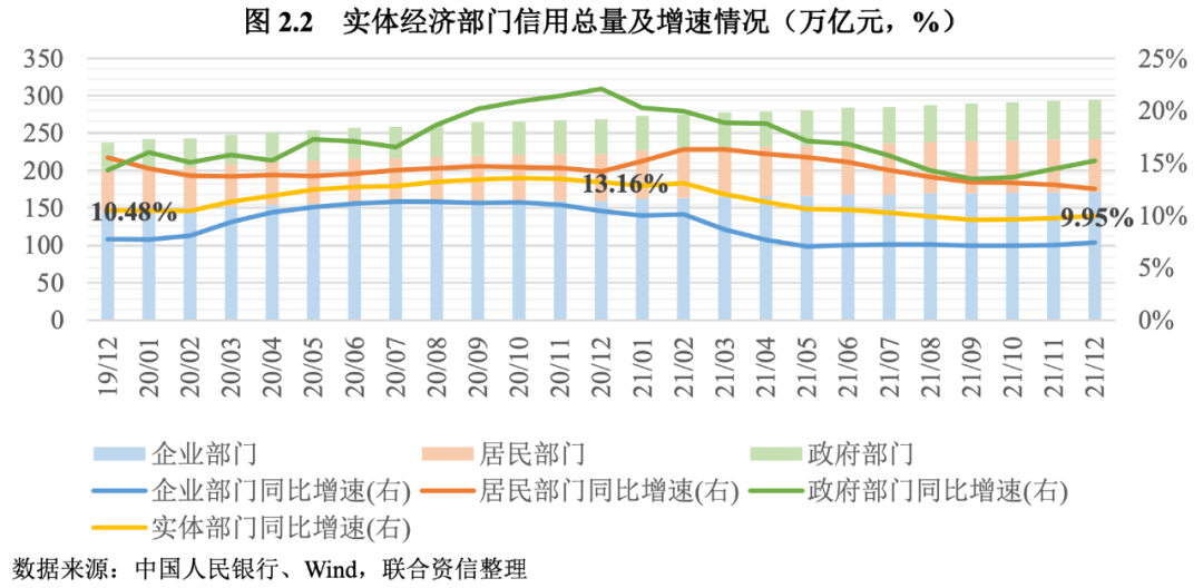 ?2021年,央行綜合運用降準、公開市場操作、中期借貸便利等工具,保持流動性合理充裕,貨幣供給靈活適度,企業綜合融資成本穩中有降。隨著新冠肺炎疫情逐步恢復平穩態勢,局部地區發生的本土聚集性疫情基本也能做到短時間內控制,實體經濟部門信用擴張增速逐步趨緩,杠桿率有所回落。各部門信用量仍延往年趨勢變動,即企業部門信用量占比連年下降,政府部門及居民部門信用量占比持續提升,從杠桿率看,企業部門杠桿降幅最大,居民部門杠桿保持相對平穩,政府部門杠桿水平呈現V型增長。