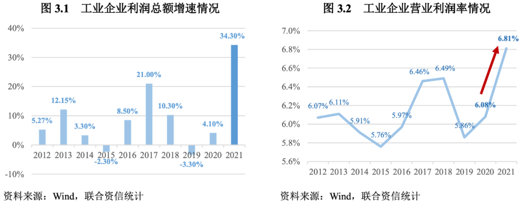 工業企業盈利水平周期性提升,企業抵御外部風險能力增強。2021年隨著工業品價格飆升,我國工業企業經營狀況較2020年疫情爆發階段回暖,工業企業整體盈利水平及盈利能力提升,有利于企業增加積蓄儲備,特別是上游工業企業,為抵抗2022年可能面臨的供需矛盾提供了緩沖墊,提升了抵御短期信用風險的能力。同時,經過2015年“三去一降一補”的陣痛改革,企業財務彈性改善,應對2022年可能面臨的經濟波動及資產價格變化更具韌性。