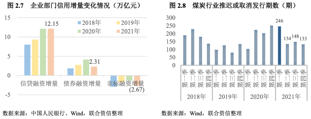 2021年,企業部門信貸融資、債券融資持續增長,非標融資存量壓降。企業信貸融資體現“穩”字,力度較上年相當,仍舊較強。從增速看,2021年企業信貸融資余額122.68萬億元,同比增長10.99%,增速較上年持平且全年增速保持平穩。從增量看,2021年信貸融資增量12.15萬億元,較2020年疫情高發期間維持相當水平,全年保持了較強的信貸力度。企業債券融資受“永煤事件”影響,一季度增速大幅下降,隨后企穩。2021年末,企業債券融資余額29.93萬億元,同比增長8.36%,一季度企業債券融資增速大幅下降,主要系2020年的“永煤事件”引發債券市場對地方國有企業信用風險的擔憂,投資人對煤炭行業及部分地區發行的債券采取一刀切措施,債券取消或延遲發行期數較多(見圖8),擔憂情緒延續至2021年一季度,使得企業債券融資增速大幅下滑。二季度以來,隨著監管機構對債市逃廢債行為的嚴厲處罰,以及煤炭行業經營層面景氣度持續升溫[2],債券市場投資人信心逐步修復。企業非標融資壓降力度明顯提升,未來壓減空間有限。2021年末,企業非標融資余額18.24萬億元,同比下降12.77%,2021年以來監管部門加大對表內外風險資產處置,信托融資類業務在2020年壓降計劃基礎上再降20%,非標融資壓降力度顯著提升。2021年是資管新規過渡期延長期限的最后一年,預期2022年非標融資仍會規范化管理,但預期壓降力度較2021年有限。