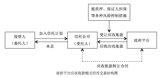 以目前政府平臺(tái)融資主要采用的應(yīng)收賬款轉(zhuǎn)讓加回購(gòu)的融資模式為例,信托公司發(fā)行信托計(jì)劃,募集信托資金,受讓政府融資平臺(tái)持有的應(yīng)收賬款,以該資產(chǎn)未來(lái)的現(xiàn)金流作為信托計(jì)劃的未來(lái)現(xiàn)金流入來(lái)源,平臺(tái)公司以此融入資金,到期后由其回購(gòu)應(yīng)收賬款,實(shí)現(xiàn)信托計(jì)劃退出。