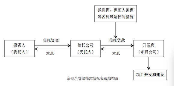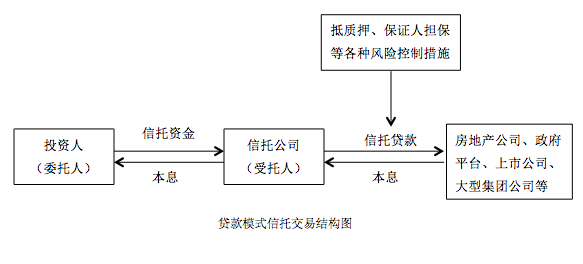 信托公司通過(guò)信托計(jì)劃向投資人募集資金并向房地產(chǎn)公司、政府平臺(tái)、上市公司、大型集團(tuán)公司等發(fā)放貸款,融資方以其關(guān)聯(lián)資產(chǎn)進(jìn)行抵質(zhì)押、保證人擔(dān)保等各種風(fēng)險(xiǎn)措施保證債權(quán)安全,到期后由融資方還本付息。