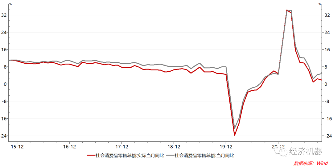 具體看,可選消費(fèi)中,汽車和建筑裝潢保持疲弱,石油制品和家電增速改善。汽車消費(fèi)下降,可能與供應(yīng)鏈斷裂下的“芯片危機(jī)”有關(guān),更反映了周期下行下的需求疲弱。建筑裝潢銷售額下降與近期地產(chǎn)市場(chǎng)快速惡化趨勢(shì)像吻合。石油及制品增速大幅上升,更多地是油價(jià)高企帶來的價(jià)格效應(yīng)。考慮到汽車銷量的下降,剔除價(jià)格因素后,石油消費(fèi)會(huì)弱的多(圖4)。