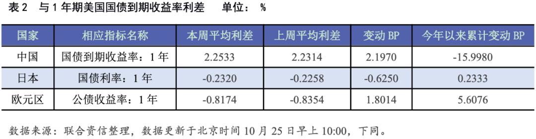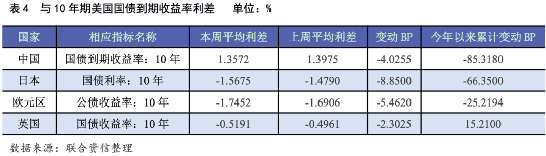 本周各期限中美國債平均收益率利差走勢不一,1年期中美國債平均收益率利差分別較上周走擴2.20個BP至2.25%;5年期和10年期中美國債平均收益率利差分別較上周收窄4.26個和4.03個BP至1.68%和1.36%。本周1年期、5年期和10年期日美國債平均收益率利差分別較上周走擴0.63個、10.20個和8.85個BP至-0.23%、-1.27%和-1.57%。本周1年期歐元區(qū)公債與相應期限美債平均收益率利差分別較上周收窄1.80個BP至-0.82%;5年期和10年期歐元區(qū)公債與相應期限美債平均收益率利差分別較上周走擴3.77個和5.46個BP至-1.63%和-1.75%。本周5年期英美國債平均收益率利差分別較上周收窄2.54個BP至-0.33%;10年英美國債平均收益率利差分別較上周走擴2.30個BP至-0.52%。