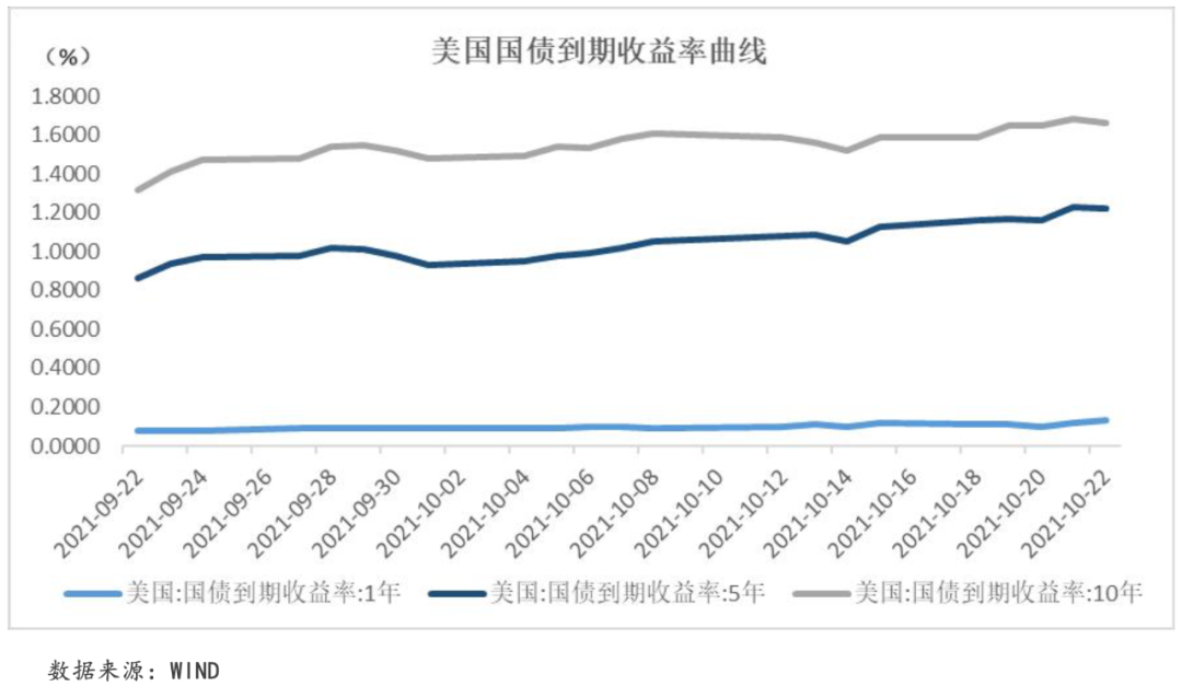 本周,美國公布數(shù)據顯示美國高通脹仍將持續(xù)運行,各期限美債收益率紛紛上漲。具體來看,本周1年期、5年期和10年期美國國債平均收益率較上周上漲0.65個BP、10.05個BP和8.10個BP至0.11%、1.19%和1.65%。