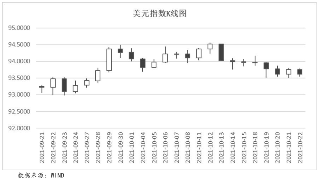 本周,美元指數(shù)出現(xiàn)下跌。一方面,美國“褐皮書”顯示經濟增速已呈現(xiàn)放緩的狀態(tài),打壓美元走勢;另一方面,隨著美國PMI制造業(yè)數(shù)據的釋出顯示美國勞動力和供應鏈的問題仍將繼續(xù)限制制造業(yè)的恢復,市場對美國經濟的復蘇預期受到打壓。截至本周五,美元指數(shù)收于93.6116,周內累計收跌0.38%。