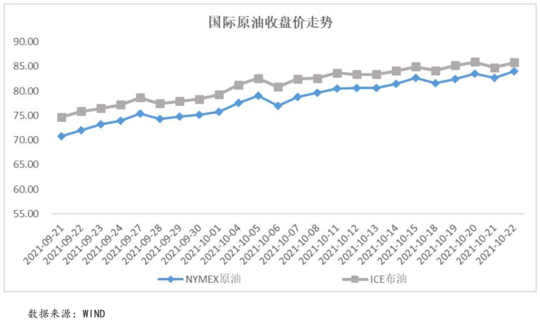 本周,國際油價繼續(xù)周內全面上漲。一是隨著全球經濟復蘇步伐的加快,石油需求顯著上升,如10月美國和歐元區(qū)PMI制造業(yè)和服務業(yè)活動指數(shù)仍然高于50,經濟活動仍在擴張;二是隨著亞洲市場對石油需求的上升(韓國11月原油購買量創(chuàng)下歷史最高水平),當下的石油供給結構將進一步緊張。三是各國能源儲備逐漸下降的基礎上,OPEC+仍保持原計劃產出,供應趨緊。總體來看,在供應不足的條件下,強勁的需求拉動石油價格上揚。截至本周五收盤,NYMEX原油價格收于83.98美元/桶,周內累計收漲2.41%;ICE布油價格收于85.77美元/桶,周內累計收漲0.97%。