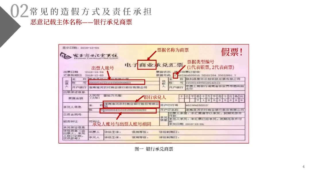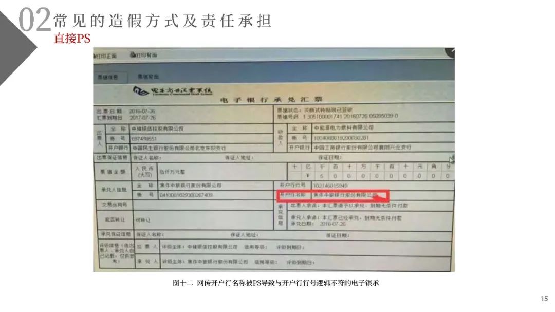 (一)不法分子精心設計、反復嘗試,通過在不同的銀行反復多次開戶的方式尋找開戶銀行的系統漏洞。利用部分開戶銀行未對票據行為人與實際開戶企業名稱進行一致性校驗的漏洞,通過在商業承兌匯票的承兌人名稱或保證人名稱上惡意記載為“中國某行”、“某行股份有限公司”或“某某銀行”的方式簽發電子商業承兌匯票,企圖冒充銀行承兌匯票;