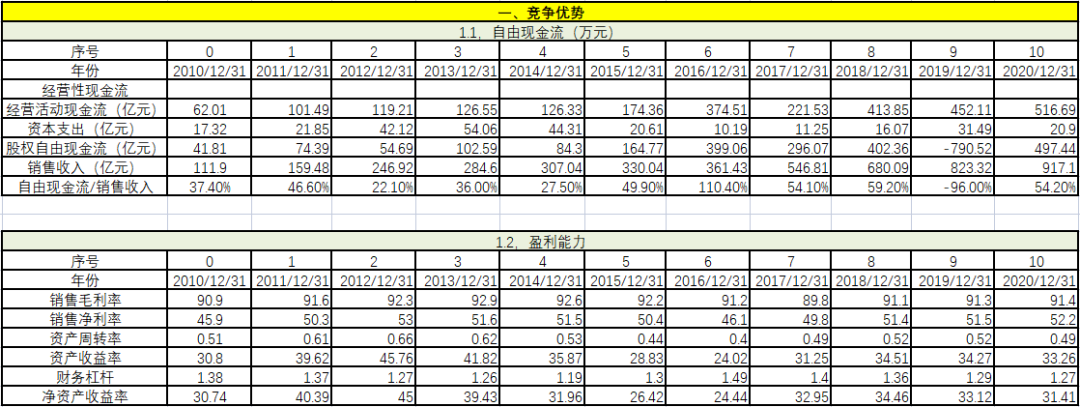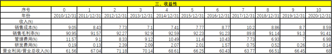 從競(jìng)爭(zhēng)優(yōu)勢(shì)上看,自由現(xiàn)金流/銷售收入在過去11年中有1年為負(fù),剩余10年都遠(yuǎn)遠(yuǎn)大于5%,經(jīng)營績效異常穩(wěn)健。毛利率基本不變,維持在90%以上,說明對(duì)上下游都有極強(qiáng)的把控力。在毛利率不變的情況下,凈利率穩(wěn)步提升。資產(chǎn)周轉(zhuǎn)率基本保持不變,說明企業(yè)雖然在變大,但經(jīng)營效率持續(xù)穩(wěn)定。資產(chǎn)收益率和凈資產(chǎn)收益率穩(wěn)步提升,財(cái)務(wù)杠桿略有下降。從這些指標(biāo)可以看出,該企業(yè)的競(jìng)爭(zhēng)優(yōu)勢(shì)非常明顯。