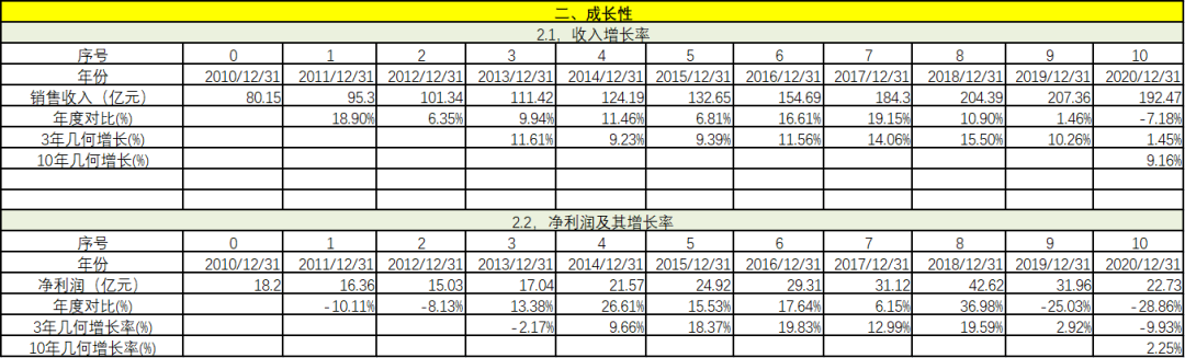 從成長性上看,過往10年保持12.99%的成長,還算行,但是,凈利潤增長率太低了,不忍直視。凈利潤沒有隨著企業(yè)的增長而增長,這可能說明企業(yè)的經(jīng)營存在問題。