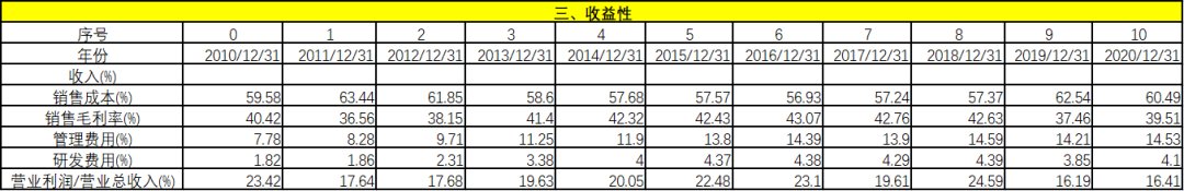 從收益性上看,管理費(fèi)率略有下降,對(duì)于股東來講,這是個(gè)好消息,該企業(yè)并沒有隨著銷售的增加給員工提升薪酬或者福利,值得信賴。研發(fā)費(fèi)用占比很低,對(duì)于酒類企業(yè),基本不需要研發(fā)。因此,研發(fā)費(fèi)用低并不影響未來的企業(yè)發(fā)展。營業(yè)利潤/營業(yè)總收入穩(wěn)步上漲。