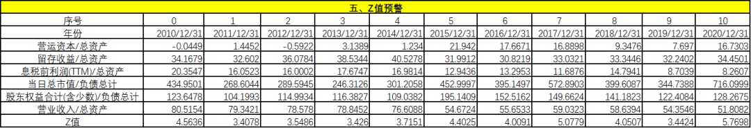 從上面的Z值可以看出,該企業(yè)的Z值很高,都超過了2.675,財(cái)務(wù)狀況良好,發(fā)生破產(chǎn)的概率非常小。