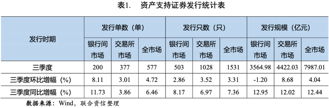 [1]統計期以債券發行日為準,統計范圍包括銀行間市場、上交所和深交所市場公募和私募發行的資產支持證券,不包括全國中小企業股份轉讓系統、機構間私募產品報價與服務系統、上海保險交易所、證券公司柜臺市場發行的資產支持證券。