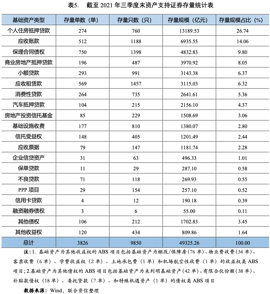 截至2021年三季度末,債券市場上共有3826單9850只資產支持證券存續,本金存量規模為49325.26億元。從存量規模占比來看(見表5),前五大基礎資產類型分別為個人住房抵押貸款(26.74%)、應收賬款(14.06%)、保理合同債權(9.80%)、商業房地產抵押貸款(8.05%)和小額貸款(6.37%)。