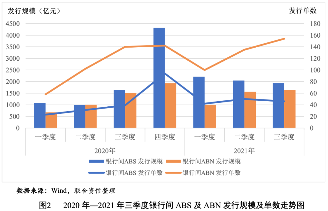 從銀行間市場來看,2021年三季度,信貸資產支持證券(以下簡稱“銀行間ABS”)共發行46單131只,發行規模為1936.21億元,發行單數、只數和發行規模環比均有所下降,與上年同期相比,發行單數、只數、發行規模均大幅上升;銀行間資產支持票據(以下簡稱“銀行間ABN”)共發行154單372只,發行規模為1628.77億元,發行單數、只數和規模環比、同比均有所增長(見表2和圖2)。總體看,三季度銀行間ABS發行單數、只數和規模同比增幅較銀行間ABN更高,主要源于基礎資產為小額貸款的資產支持證券發行同比增幅較大,在引導金融機構加大對小微企業支持力度的政策背景下,發行小微企業貸款ABS是銀行用來盤活存量小微貸款、打通小微企業融資渠道、助力普惠金融發展的一項重要舉措。