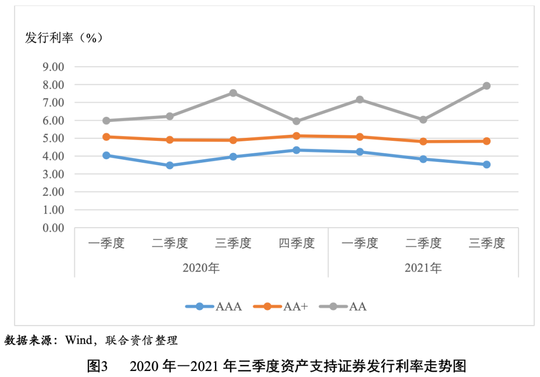 2021年三季度資產支持證券市場規模穩步增長,共發行577單1531只資產支持證券,發行規模7987.01億元,環比和同比均有所上升,其中交易所市場資產支持證券的發行規模環比增幅高于銀行間市場,銀行間ABS發行單數、只數和規模同比增幅較銀行間ABN更高。資產支持證券發行信用等級主要集中于AAAsf和AA+sf,AAAsf、AA+sf和AAsf級資產支持證券的發行利差均值分別為113BP、247BP和564BP,各信用等級利差檢驗均具有顯著差異,信用評級對資產支持證券的信用風險具有良好的區分度。