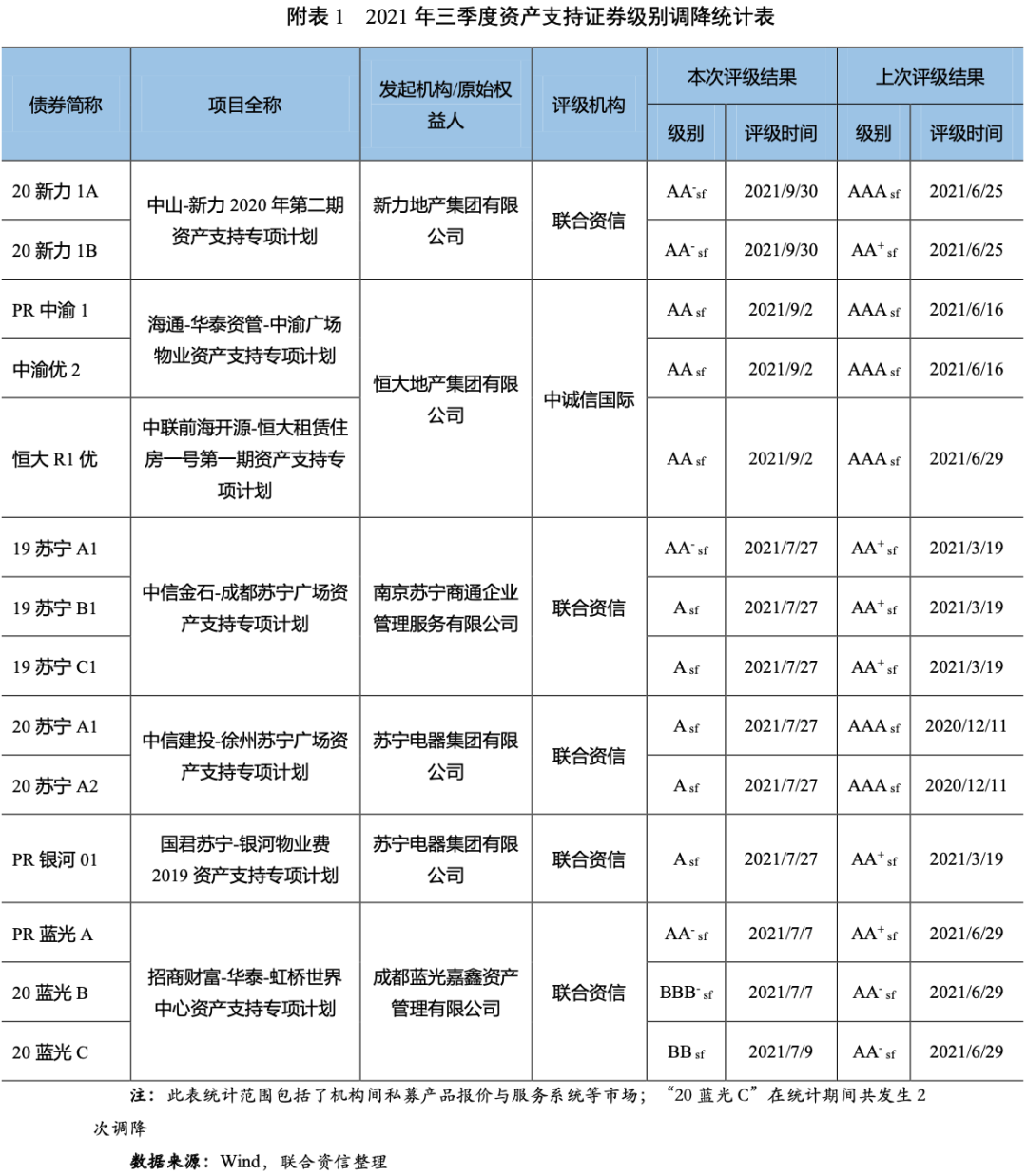 級別下調方面,市場共有5家原始權益人發起的7單14只資產支持證券債項評級發生下調,原始權益人家數同比增加2家,發行單數同比增加4單,只數同比增加7只。本季度資產支持證券發生評級下調的級別變動較大,其中8只債券下調3個級別及以上。本季度級別下調資產支持證券涉及的行業為房地產。從級別下調原因來看,本季度資產支持證券級別下調主要原因是2021年以來國家加大對房地產行業的調控,在“三道紅線”、“兩個集中”等政策壓力下,房地產企業銷售增速下滑,投資增速回落,短期償債壓力加大,在此背景下,負債率較高、擴張較為激進的恒大地產集團有限公司(海通-華泰資管-中渝廣場物業資產支持專項計劃和中聯前海開源-恒大租賃住房一號第一期資產支持專項計劃的差額支付承諾人)、新力地產集團有限公司(中山-新力2020年第二期資產支持專項計劃的差額支付承諾人)和四川藍光發展股份有限公司(招商財富-華泰-虹橋世界中心資產支持專項計劃的差額支付承諾人)深陷債務危機,造成相關債券級別的大幅下調。此外,受蘇寧電器集團有限公司主體級別發生下調影響,其作為差額支付承諾人的中信建投-徐州蘇寧廣場資產支持專項計劃和國君蘇寧-銀河物業費2019資產支持專項計劃以及其作為擔保人的中信金石-成都蘇寧廣場資產支持專項計劃的相關債券級別均出現大幅下調。