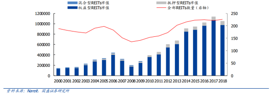 美國是全球最早發展REITs的國家,1960年美國《國內稅收法案》和《房地產投資信托法案》明確了REITs的稅收結構與法律框架,1965年,首只REITs于紐交所上市,標志著REITs市場的啟動。隨著政府允許滿足條件的REITs免征所得稅和資本利得,REITs得到快速的發展,如今美國的REITs市場已經發展的很成熟了,這種成熟不僅體現在產品的設計、操作流程和信息披露,也體現在與REITs市場相對應的法律框架的完備上。目前已經超過30個國家引進REITs制度并形成交易市場。截至3月末,美國上市REITs共225只,市值合計1.216萬億美元。