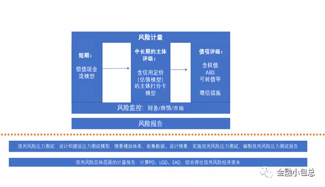 管理機制通過十個模塊的合力,達到監(jiān)管要求的可監(jiān)測、能計量、能分析、可應(yīng)對。而其中核心的是通過內(nèi)評體系提升前臺信評的風(fēng)險識別和風(fēng)險計量能力、輔助中臺信用風(fēng)險管控工作。