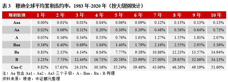 2.相較于穆迪全球,我國高級別違約率偏高,低級別違約率偏低,呈“平坦”化分布。AAA的各年限違約率較穆迪均偏高,且第一年就有違約,而穆迪在第二年后才出現違約;低評級方面,例如:國內B級8年期平均累積違約率為21.74%,低于穆迪的29.65%。這說明相較于穆迪的國際評級序列來說,我國部分高評級主體的級別是虛高的,其實際信用風險高于其評定級別的信用風險定義,應降低這部分主體的評級級別,從而使高級別違約率回歸至合理水平。而低級別違約率偏低,一是因為樣本不足,統計結果的統計意義不強;二是跟早年我國信用債券市場的“剛兌”思想有關,部分低評級主體在各方協調下最終兌付,使得低評級違約率較全球水平來說偏低;另外,當虛高級別主體的評級下調后,一定程度上也會提升低評級違約率。