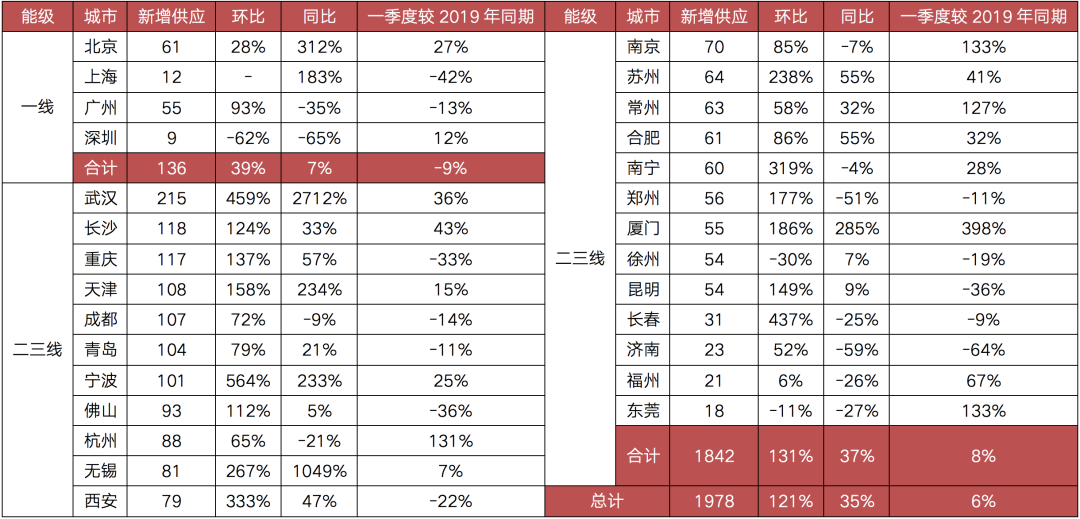 3月,24個重點監測二三線城市合計供應1842萬平方米,環比增131%,同比增37%,前3月累計規模較2019年增長8%。隨著3、4月樓市傳統“小陽春”的到來,核心二線以及強三線城市仍是房企布局重心,如武漢、天津、寧波、無錫、廈門等城市供應量顯著增加,同、環比增幅均超100%。