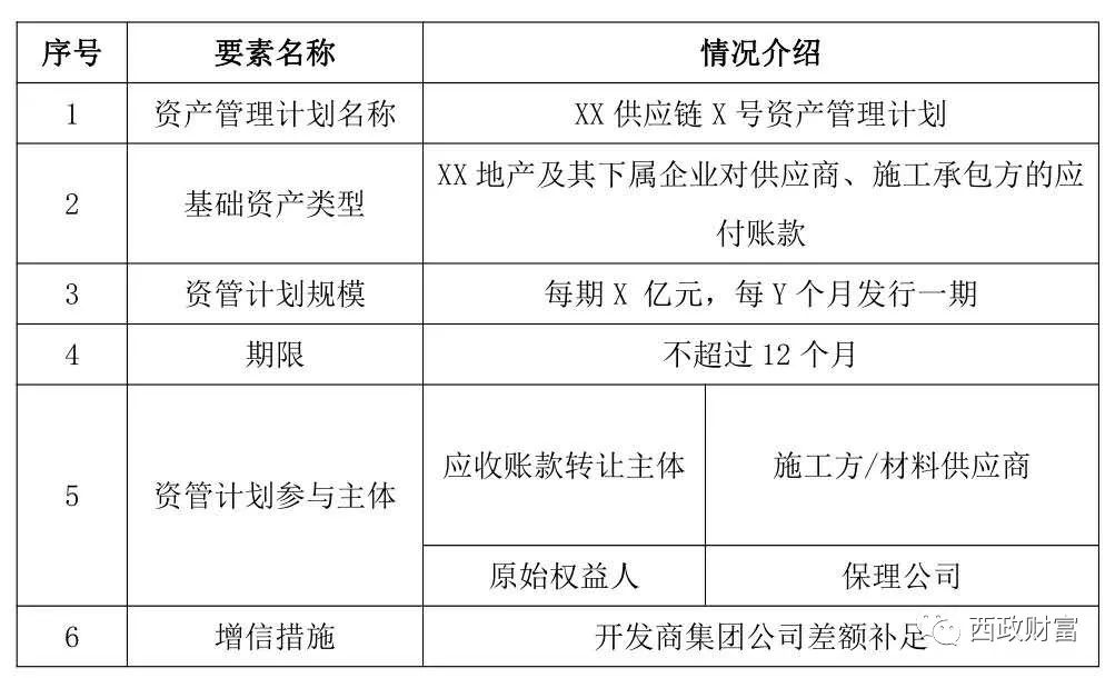 證券公司或其基金子公司作為管理人設(shè)立資產(chǎn)管理計(jì)劃,投資人通過(guò)資管計(jì)劃投資應(yīng)收賬款,即上游供應(yīng)商(債權(quán)人)對(duì)核心企業(yè)XX地產(chǎn)及其下屬公司(債務(wù)人)享有的應(yīng)收賬款債權(quán)。應(yīng)收賬款資產(chǎn)包括供應(yīng)商因向核心企業(yè)及其下屬公司提供境內(nèi)貨物買(mǎi)賣/服務(wù)貿(mào)易或境內(nèi)工程承包/分包服務(wù)等而對(duì)核心企業(yè)及其下屬公司享有未到期應(yīng)收賬款債權(quán)。