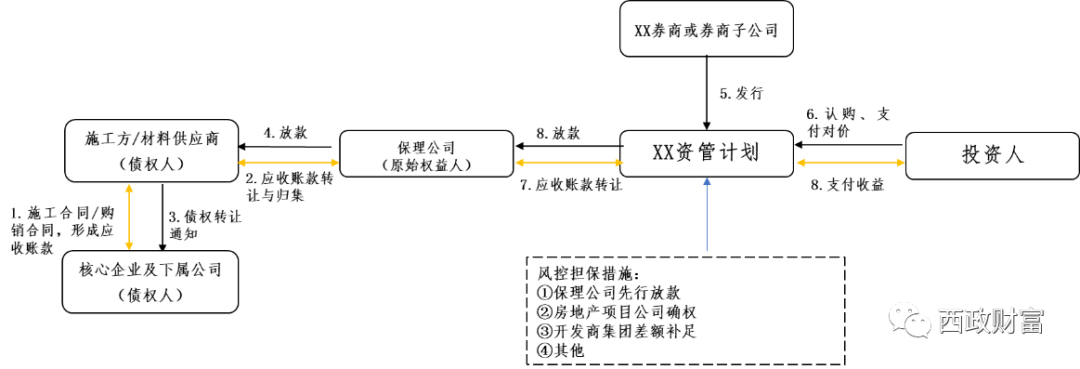 (2)西政保理向施工方、材料供應(yīng)商放款,并將該應(yīng)收賬款債權(quán)轉(zhuǎn)讓給XX資管計(jì)劃;