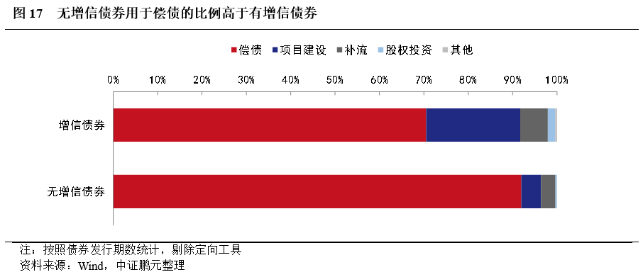 1.約70%的高級別增信債券募集資金用于償還到期債券和債務,僅有約20%的債券用于項目建設
