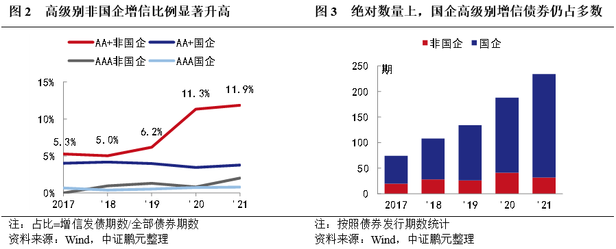 近年來,高級別主體(主體評級為AA+或AAA)增信發債的數量逐漸增多,特別是高級別的非國有企業增信發債的比例逐漸提高。