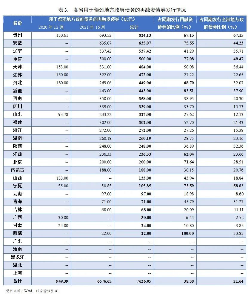 截至2021年6月末,貴州發(fā)行用于償還地方政府債務(wù)再融資債券的規(guī)模最大,高達(dá)824.13億元,占該省同期(2020年12月及2021年上半年)發(fā)行再融資債券的比例為67.15%,占該省期間發(fā)行全部地方政府債券的67.15%。安徽、遼寧、重慶、天津、江蘇、河北、新疆等省份發(fā)行規(guī)模亦不小,均在400億元以上。