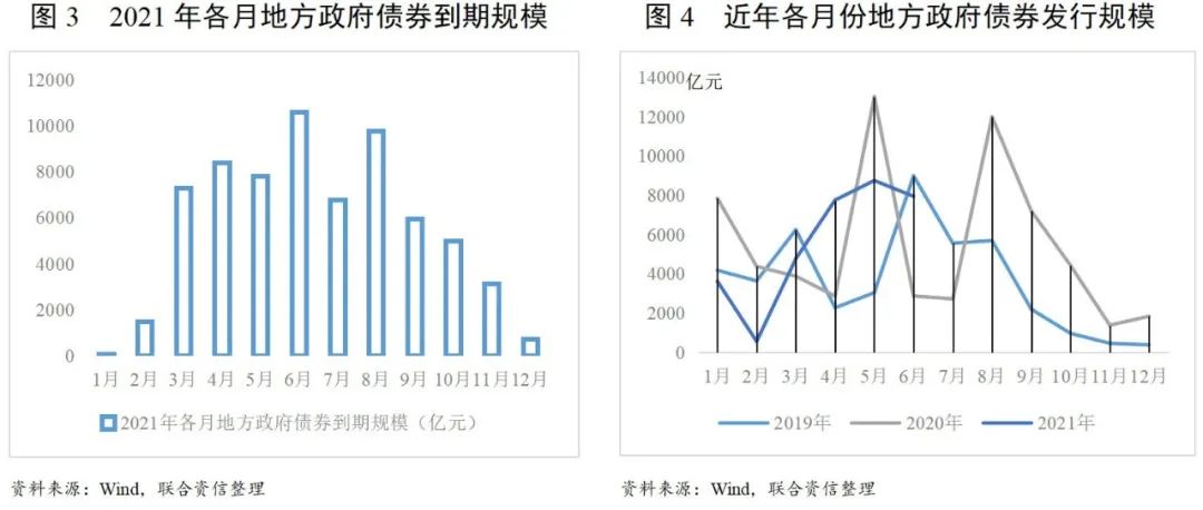 從地方政府債券發(fā)行月份來看,2021年1月為“用于償還地方政府存量債務(wù)”再融資債券的集中發(fā)行期間,全月發(fā)行3623.36億元再融資債券,全部用于償還地方政府存量債務(wù),或與當(dāng)月地方政府債券到期規(guī)模小有關(guān)(圖3)。隨后,化債用途再融資債券發(fā)行規(guī)模逐月減少,在當(dāng)期發(fā)行的再融資債券比例及當(dāng)期發(fā)行的全部地方政府債券比例亦降低。2021年5月及6月化債用途再融資債券發(fā)行規(guī)模回升,占當(dāng)期發(fā)行再融資債券的比例也有所回升。根據(jù)2019年至今各月份地方政府債券發(fā)行情況看,每年5至9月為地方政府債券發(fā)行高峰(圖4),按現(xiàn)有規(guī)模及比例看,預(yù)期2021年下半年仍有較大規(guī)模再融資債券用于緩解地方政府債務(wù)壓力。
