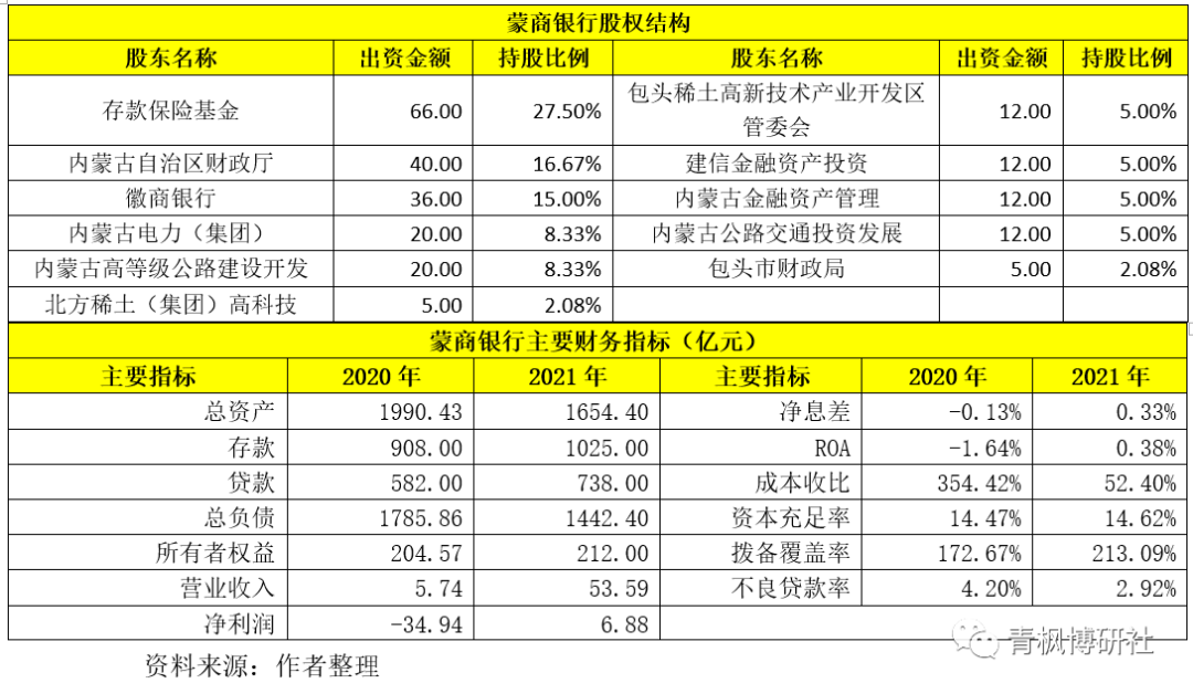 2、新成立的蒙商銀行注冊資本為200億元,股東出資為240億元。目前存款保險基金、內(nèi)蒙古財政廳和徽商銀行分別位列蒙商銀行前三大股東,持股比例分別為27.50%、16.67%和15.00%。