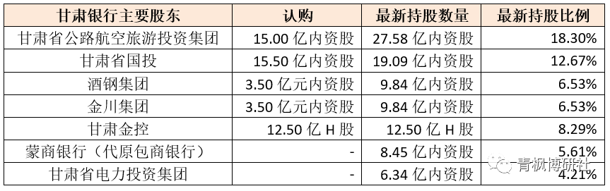 經(jīng)過此次改革重組后,甘肅省公路航空旅游投資集團、甘肅省國投、酒鋼集團、金川集團、甘肅金控以及甘肅省電力投資集團合計持有甘肅銀行的股權(quán)比例達到56.53%,蒙商銀行的持股比例則由之前的8.39%降至目前的5.61%、由第二大股東降至第六大股東。