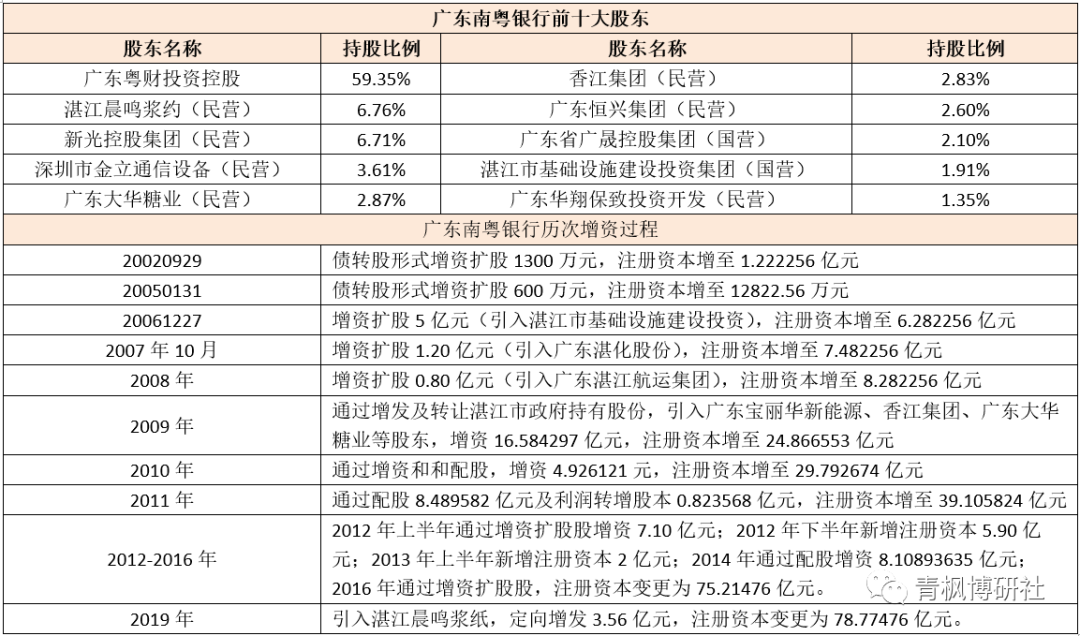 (三)廣東南粵銀行:原三家股東陷危機,引進第一大股東粵財投資控股 1、2021年12月27日,廣東銀保監(jiān)局核準(zhǔn)了南粵銀行的增資擴股方案(增發(fā)115億股股份);同年12月31日,廣東銀保監(jiān)局同意南粵銀行注冊資本金由78.77476009億元增至193.77476009億元(即新增115億元)。此次增發(fā)的115億股股份,全部由廣東粵財投資控股認(rèn)購,認(rèn)購后廣東粵財投資控股持有廣東南粵銀行總股本的59.35%,成為后者第一大股東。