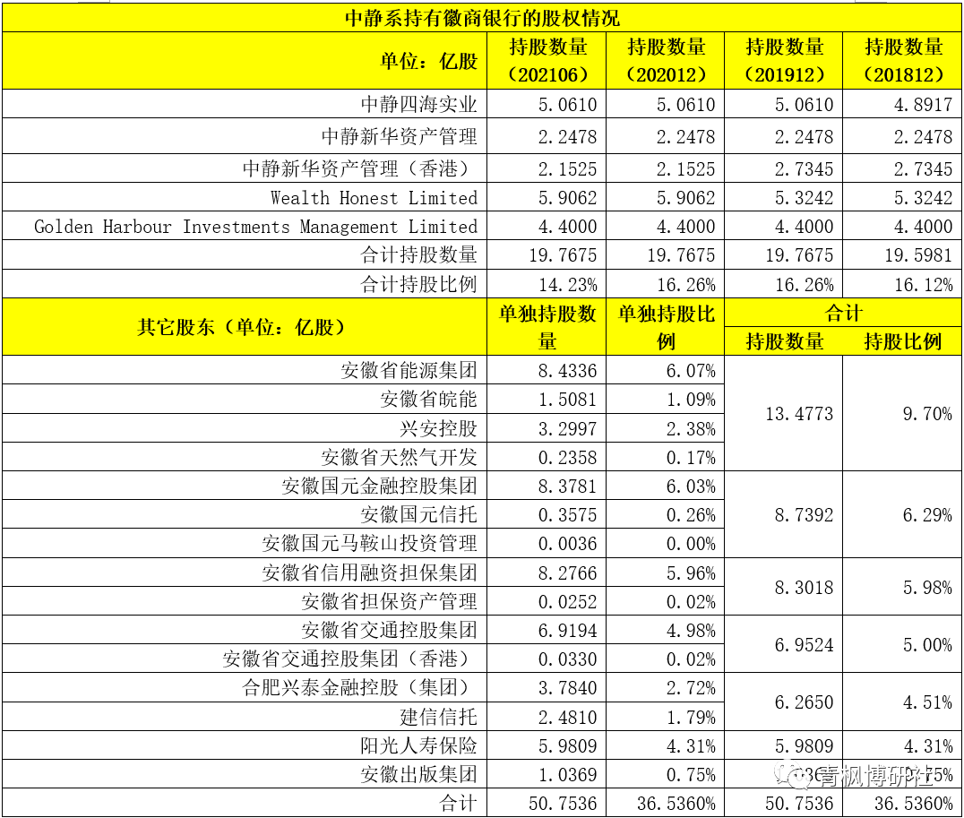 2、中靜系主要通過旗下中靜新華資產(chǎn)管理、中靜新華資產(chǎn)管理(香港)、中靜四海實業(yè)以及Wealth Honest Limited、Golden Harbor Investments Management Limited等主體持有徽商銀行股份。截至2021年6月,中靜系合計持有徽商銀行19.7675億股股份,持股比例達到14.23%,為徽商銀行第一大股東。