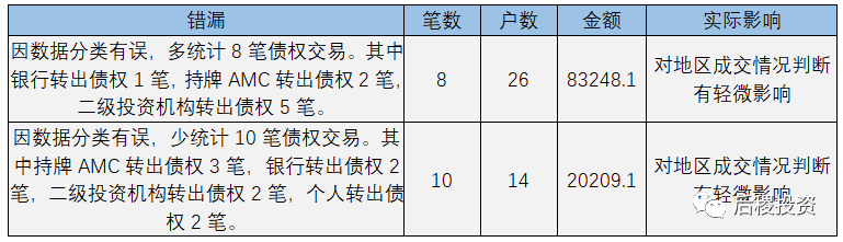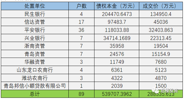 另外需要補(bǔ)充說(shuō)明的是:本次統(tǒng)計(jì)山東省2019年度成交公告共計(jì)2394戶(hù),其中債權(quán)金額未披露的有418戶(hù)。未披露金額的債權(quán)成交記錄戶(hù)數(shù)明細(xì)如下: