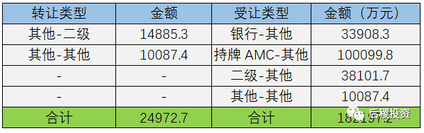 從出讓金額與受讓金額的對(duì)比中看,華融資管、山東金融、泰和資管、信達(dá)資管、東方資管受讓金額均大于出讓金額,則長(zhǎng)城資管、青島資管受讓金額小于出讓金額。